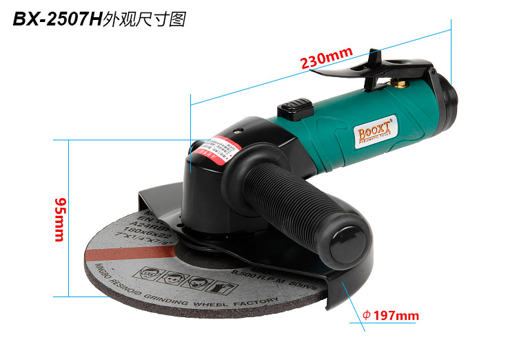 • 產(chǎn)品參數(shù): 型號(hào)規(guī)格:BX-2507H 【工業(yè)型/大功率】 砂輪尺寸:180*8*22mm(7寸) 馬達(dá)功率:2.3HP (大功率) 空載轉(zhuǎn)速:7600rpm 耗 氣 量:0.9m3/min 全 長(zhǎng):230mm 重 量:2.10kg 噪 音 值:79db(A) 【工業(yè)型/大功率】