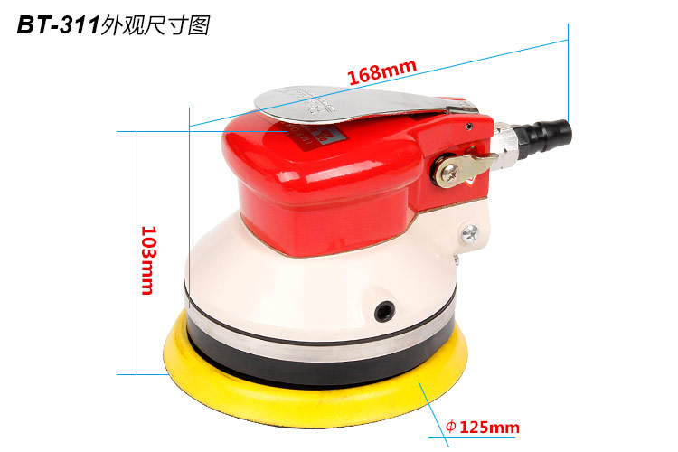 • 產(chǎn)品參數(shù): 底盤尺寸:125mm 【5寸】 空載轉(zhuǎn)速:10000rpm 偏擺直徑:5mm 重 量:1.24kg 耗 氣 量:0.48m3/min(重型粗磨)