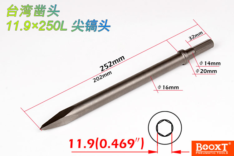 鎬尖尺寸:H11.9*250L*20W   【標(biāo)配/扁鎬頭】