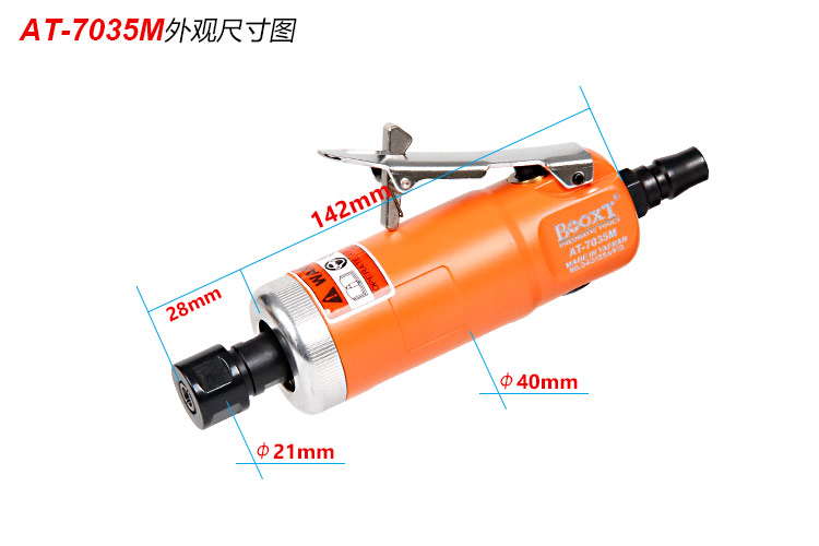 • 產(chǎn)品參數(shù): 夾頭能力:標(biāo)配M6 (可選配M3) 空載轉(zhuǎn)速:22000rpm 全 長:142mm 重 量 : 0.54kg 耗 氣 量:0.45m3/min 【專業(yè)型/前排氣】