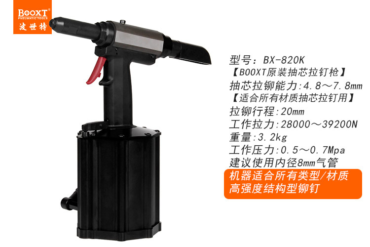 東莞市強勁五金工具有限公司提供臺灣BOOXT波世特品牌氣動工具,7.8氣動拉鉚釘槍BX-820K廠家直銷,首件享特價。咨詢熱線:4008301980