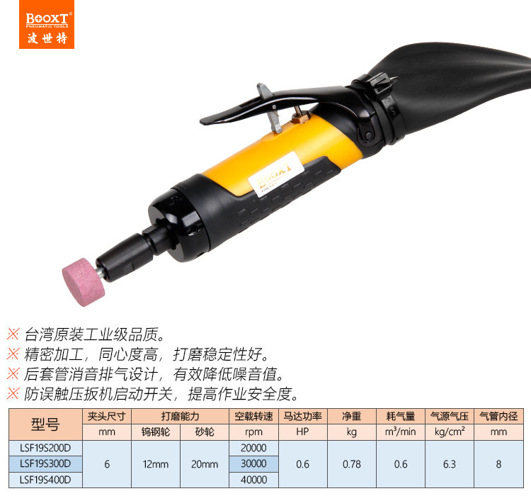 東莞市強勁五金工具有限公司提供臺灣BOOXT波世特品牌氣動工具,靜音氣動刻磨機LSF19-S300D廠家直銷,首件享特價。咨詢熱線:4008301980