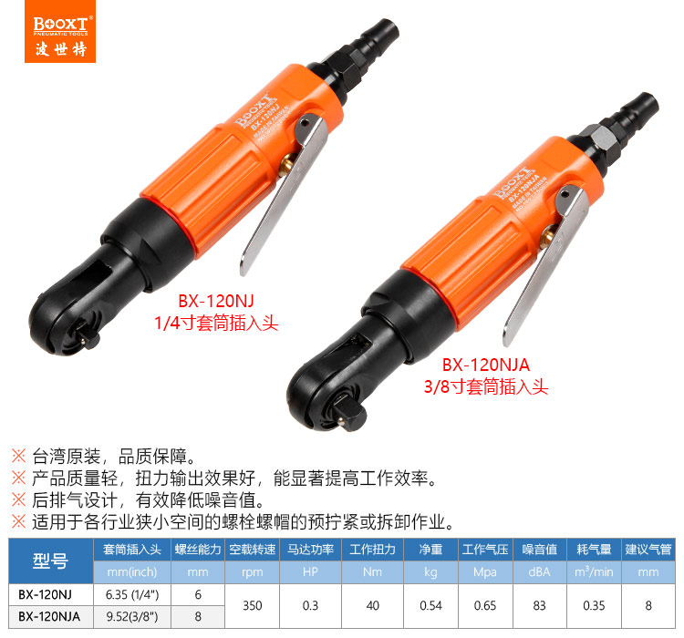 東莞市強勁五金工具有限公司提供臺灣BOOXT波世特品牌氣動工具,小飛氣動棘輪扳手BX-120NJA廠家直銷,首件享特價。咨詢熱線:4008301980