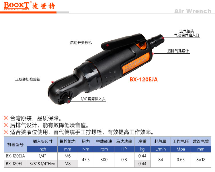 東莞市強勁五金工具有限公司提供臺灣BOOXT波世特品牌氣動工具,超短氣動棘輪扳手BX-120EJA廠家直銷,首件享特價。咨詢熱線:4008301980