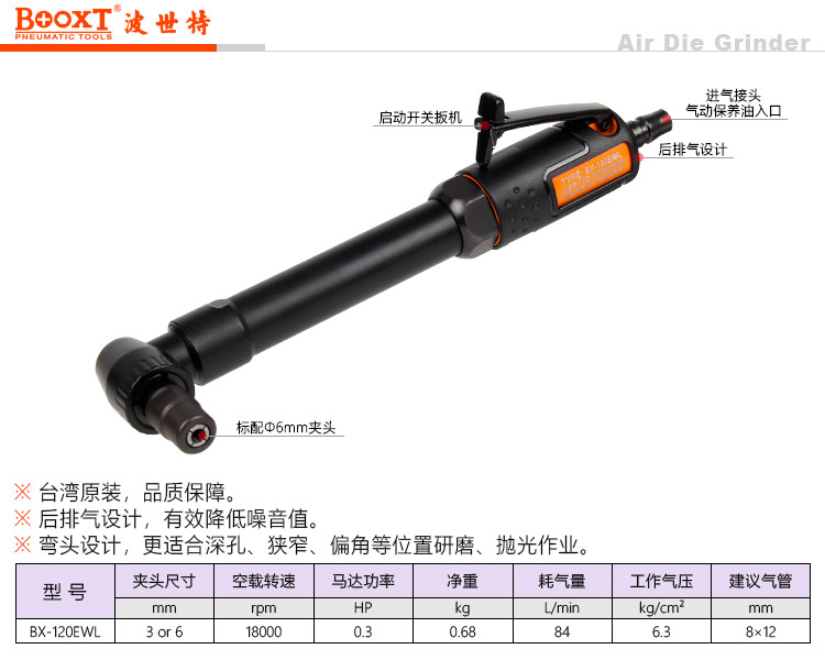 東莞市強勁五金工具有限公司提供臺灣BOOXT波世特品牌氣動工具,加長彎頭氣動打磨機BX-120EWL廠家直銷,首件享特價。咨詢熱線:4008301980