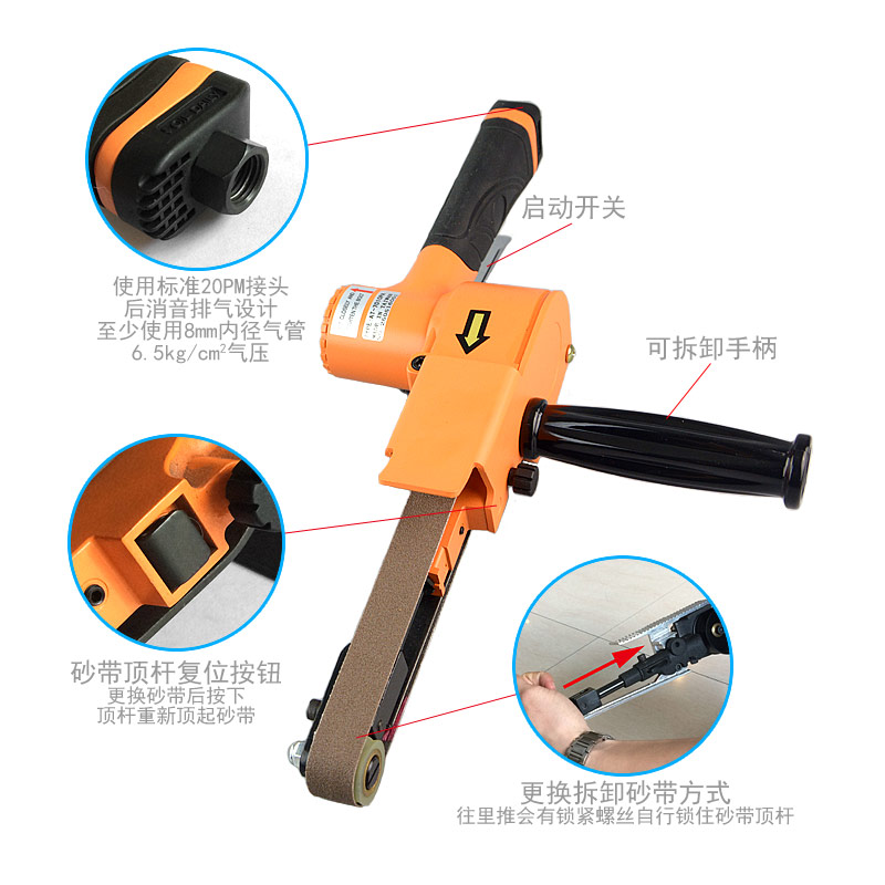 • 產(chǎn)品參數(shù): 砂帶尺寸:20×520mm; 空載轉(zhuǎn)速:17000rpm; 工具長度:406mm; 工具重量:1.32kg; 馬達功率:0.5HP; 耗 氣 量:0.4立方米/分鐘; 使用工作氣壓:0.65Mpa; 推薦使用內(nèi)徑8mm氣管; 平時使用應(yīng)多加氣動油保養(yǎng)