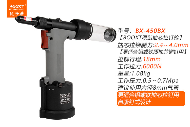 東莞市強勁五金工具有限公司提供臺灣BOOXT波世特品牌氣動工具,自吸氣動鉚釘槍BX-450BX廠家直銷,首件享特價。咨詢熱線:4008301980