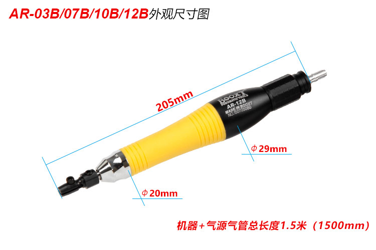 • 產(chǎn)品參數(shù): 夾頭直徑:3mm 前后行程:1.2mm 行程轉數(shù):25000bpm 外形尺寸:29*205mm 耗 氣 量:0.21m3/min 重 量:0.28kg 【經(jīng)濟型】